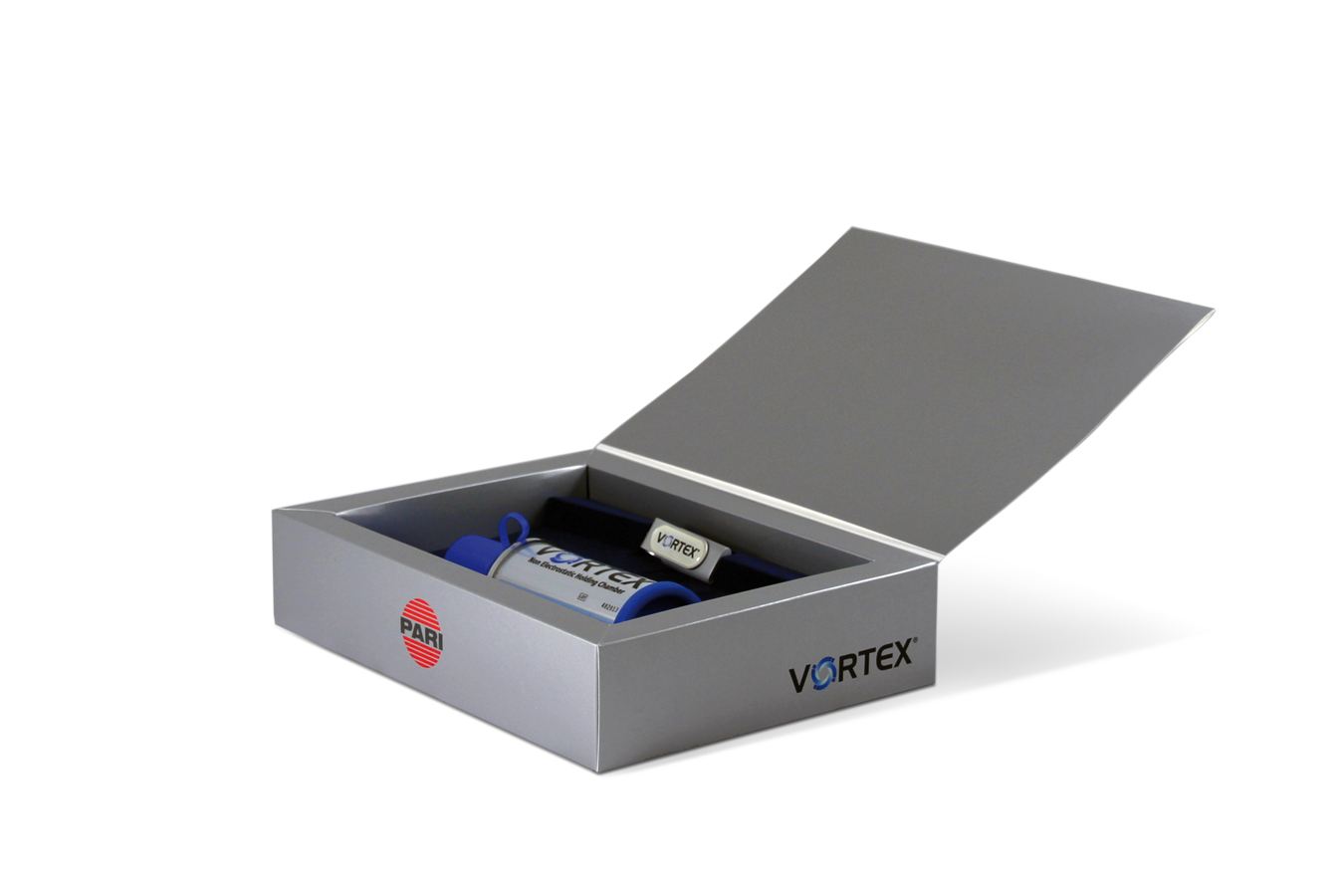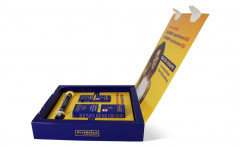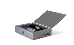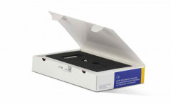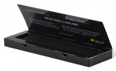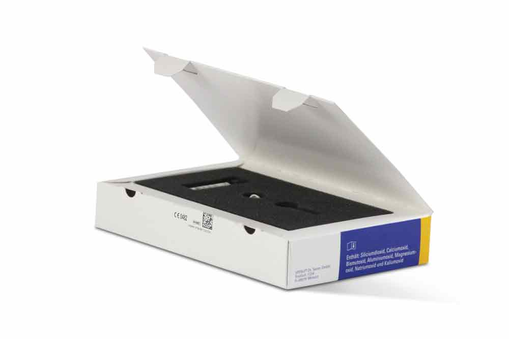 Krempelrandschachtel mit angeklebtem Deckel zur Produktpräsentation maßgenau angepasst mit einer Einlage aus E-Welle -