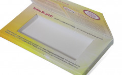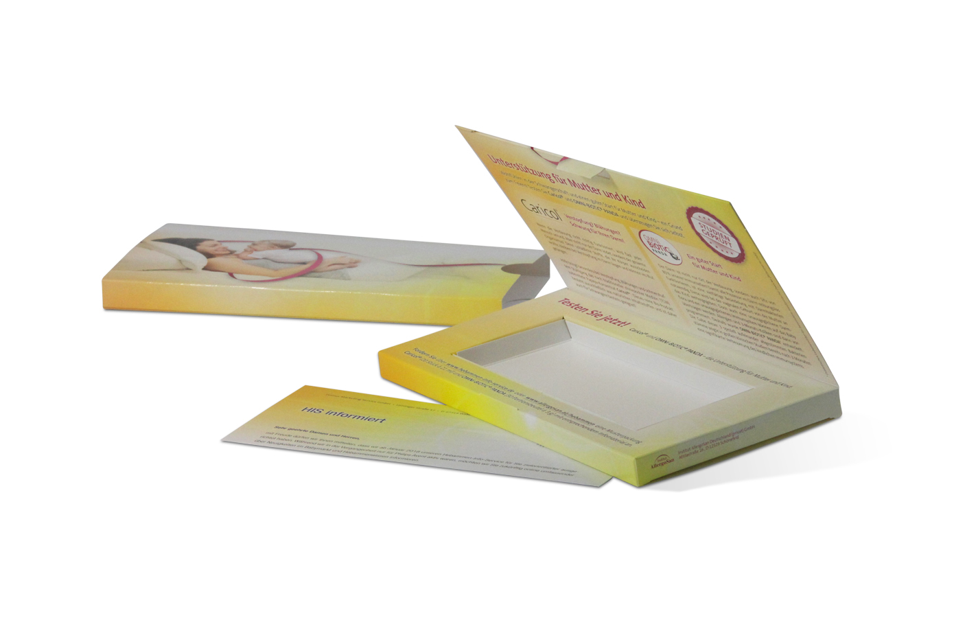 Die Königsklasse unter der Gruppe der Faltschachteln. Ein breiter Außenrand lässt die Verpackung qualitativ hochwertig wirken. Die innenliegenden Produkte kommen klar und professionell zur Geltung. Besonders Vertriebsunterlagen werden in diesen praktischen Verpackungen transportiert.