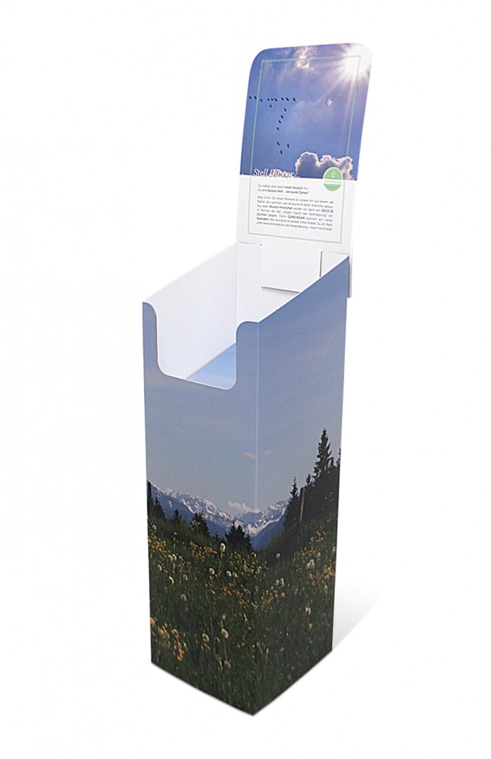 Wir fertigen Aufstellermuster genau auf Ihre Bedürfnisse zugeschnitten und passend für das inneliegende Produkt. Anschließend können wir Auflagen ab bereits einem Exemplar im Digitaldruck oder höhere Auflagen im Offsetdruck produzieren.